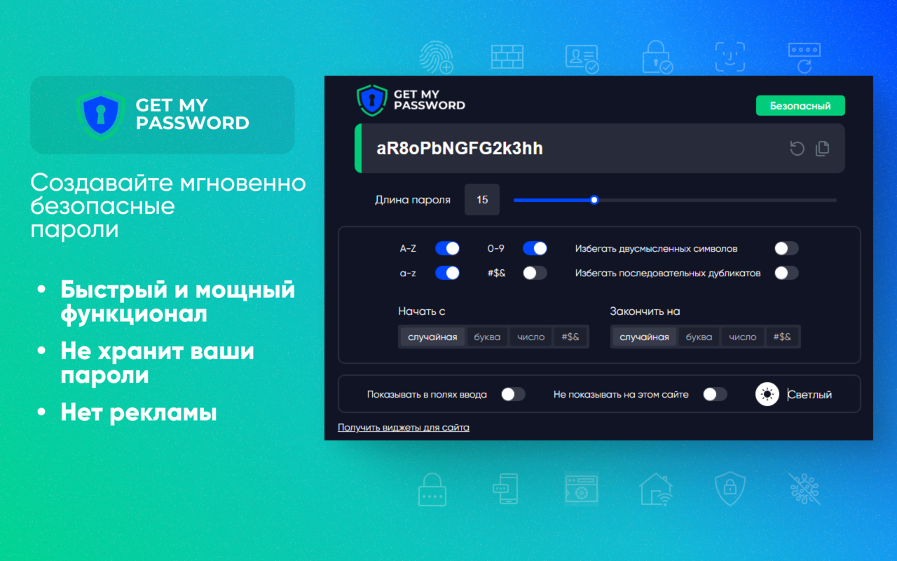 Выбирайте длину пароля, добавляйте буквы, цифры, спецсимволы – настройте безопасность под свои нужды.